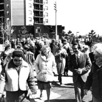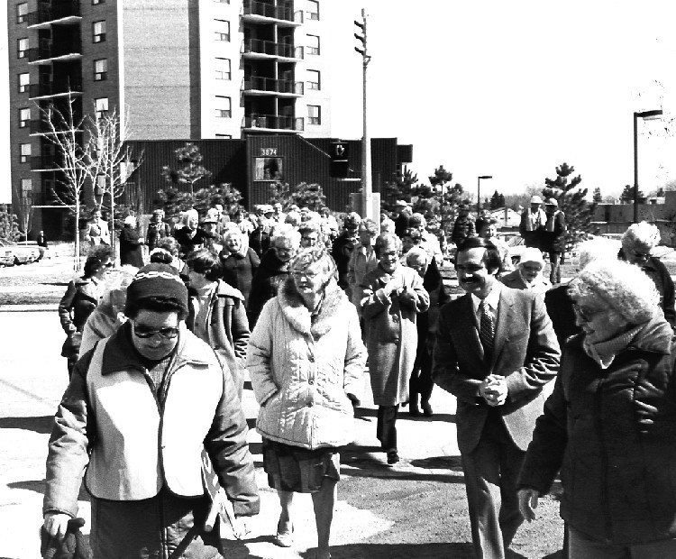 Mayor Wayne Thomson and a group of unidentified women crossing Portage Rd Stamford
