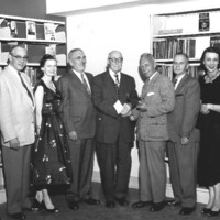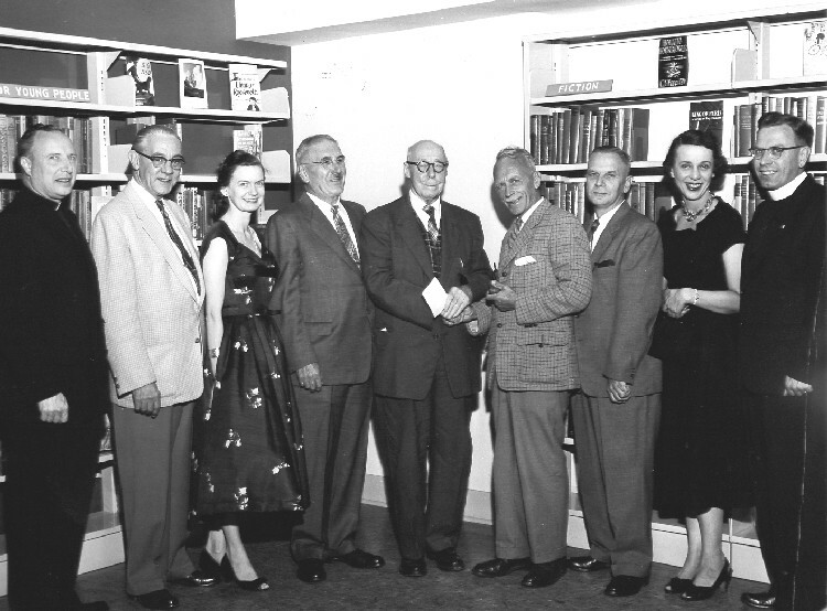 en-CA L-R: Reverend J A Sweeney, Mayor Ernest Hawkins, Elizabeth Jost Branch Librarian, Lt Colonel M B Watson Chairman Niagara Falls Public Library Board , Reeve A G Bridge, Angus Mowat Director of Public Libraries for Ontario, George King Chairman Stamford Library Board, Eileen Weber Chief Librarian, Rev W H Simpson ;