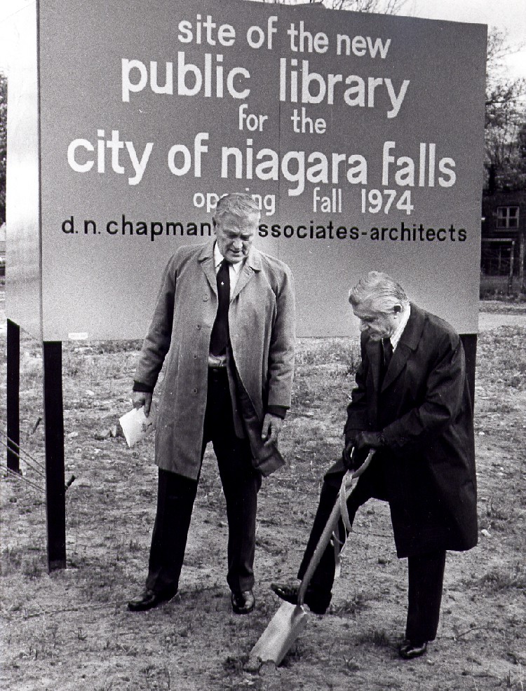 - L-R: George H Hamilton Chairman Niagara Falls Public Library Board, Mayor George Bukator