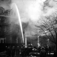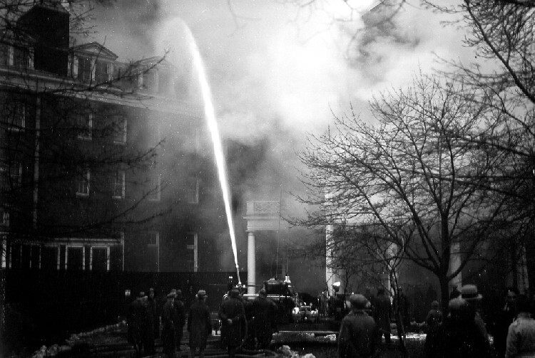 - en-CA The fire began in the north wing next to the Lafayette Hotel, very early in the morning and spread through the inside of the hotel attic ; this view shows firefighters spraying water on the north wing where it adjoined the centre section. The main entrance to the hotel was through the pillars shown here and access was by way of Falls Avenue opposite the Foxhead Hotel ;