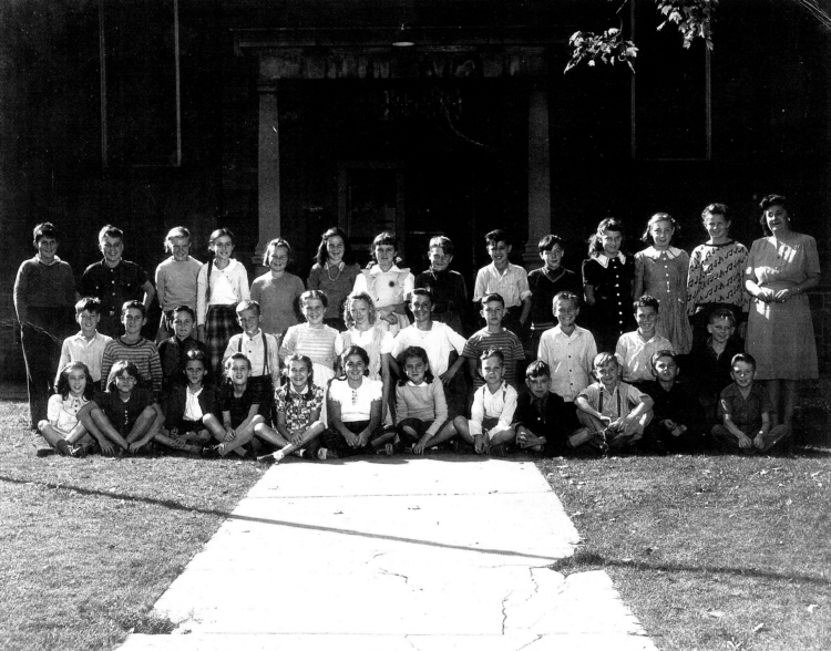 L-R; Front Row: Alice MacKenzie, Unknown, Betty Brown, Marilyn Franco, Betty Kulko, Marleen Goldchuk, Marjorie Hines, Ken Halbert (or Holbert), Martin Goyach, Bill Ort, Unknown, Bill Strang; Middle Row: Neil Turnbull, Jim Mann, Unknown, Bill Cybrinski, Vivian Weston, Pat Maguire, Leonard Snyder, Ed Leskiw, Bill Urchuk, Martin Corneyea, Melvin Morningstar; Back Row: Bill Brown, Gordon Farewell, Unknown, Rosemary Albon, Diane Flommerfeld, Donald Huffman, Bill Smithers, Louie Anderon, Cecil Austin, Jennifer Lennox, Violet Bosznich, Unknown, Unknown; Teacher Mrs. Sootheran