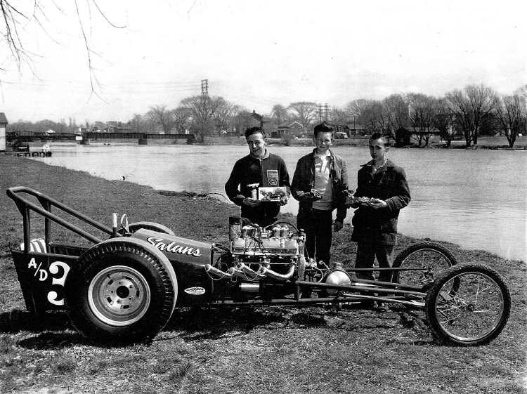 Boys standing by a Drag Racer with Chippawa Creek in the background