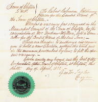 Document reads: Town of Clifton To Wit: To Robert-Robinson, Returning officer for the Centre War of the Town of Clifton. Whereas a vacancy has occured in the Municipal Council of the Town of Clifton, by the resignation of Mr. Andrew-Wallace, late a Councillor for the Centre Ward of the said Town. Theses are therefore to authorize and require you to hold a new Election, within the time and in the manner prescribed by law, to fill the afore saw vacancy. Given under my hand, and the Seal of the Corporation of the Town of Clifton, at Clifton, this sixth day of April, 1872. Geo. W. Taylor, Mayor