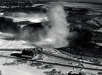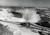 Aerial view of the Horseshoe and American Falls The American and Horseshoe Falls in winter with the ice bridge in the lower Niagara River. -