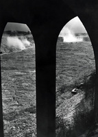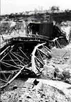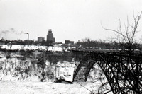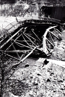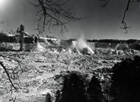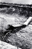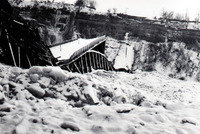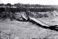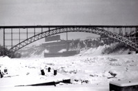 Collapsed Falls View Bridge On January 27, 1938 an ice jam, exerting enormous pressure on the abutments of the Falls View Bridge, caused it to collapse onto the ice bridge below. -