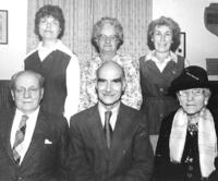 Bottom row (L to R) Wilfred Hicks (Vice President), Ted Lees (Chairman/President), Zettie May Miller (Honourary President) Top row (L to R): Jackie Glen (Secretary-Treasurer), Clara Ruch and Rita Somerville (Social Convenors). Photo taken in Willoughby Township Hall on Sodom Road.