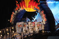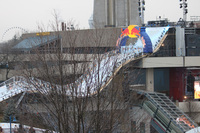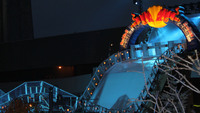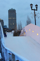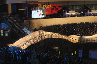 The Red Bull Crashed Ice Course illuminated at night.The Skylon Tower with a sign "Ice Cross Downhill World Championship 2013" can be seen in the background.