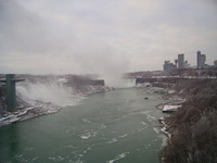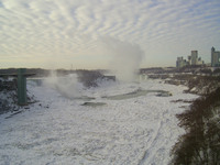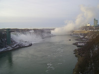 2007-01-10 Niagara Mornings 8 - January 10, 2007 Weather conditions in Niagara Falls when the photo was taken: Wind: northwest, 19 km, gusts to 33 km Temp: -5° C Horseshoe Falls sunny, American Falls cloudy, light snow. Cloud cover was just moving in. Time: 8:25 a.m. This photo from Rainbow bridge, where concrete meets steel part of bridge. -