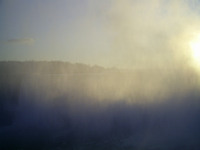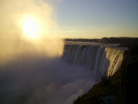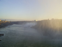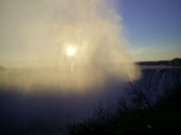 Looking through the mist at the brink of the Horseshoe Falls toward the Goat Island end of the falls with the sun low in the sky shining through the mist Taken 8:24 a.m. Weather: 1º C, wind south, 13km, sunny -