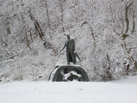 Statue of Nikola Tesla in Queen Victoria Park with a dusting of snow - 2 Statue sculpted by Hamilton artist Les Drysdale, 2006 -