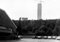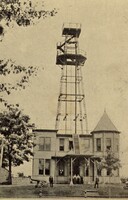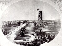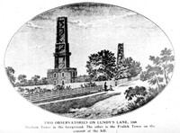 sketched in 1855 looking westward on Lundy's Lane. The Tower, the fourth tower to be built was latterly known as the Durham Tower. Note Drummond Road running northward