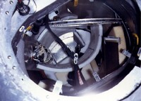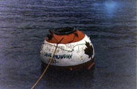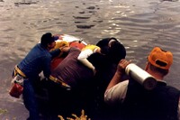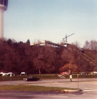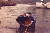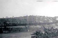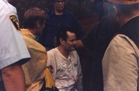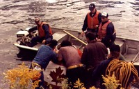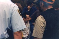 On the 9th of September 1990 Peter Debernardi along with Wayne J Harris attempted to hang a Canadian flag from one of the Spanish AeroCar's cables, some 200 feet above the Whirlpool Rapids. He attached himself to the cable by means of a harness and pulley. He then planned to roll himself out to the midpoint of the cable, attach the flag, and then expected to be rescued by the cable car. He attempted the stunt in order to protest the Niagara Parks Commission which prohibits stunting in and around the Falls ; From the personal collection of George Bailey ; Image may not be reproduced without the written permission of George Bailey ;