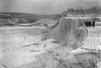 Spectators on Luna Island in the Winter The American Falls appear to be completely frozen. Judging by the number of people that can be seen both above the gorge and below it is probable that this was taken in 1938, the year that the Falls View Bridge collapsed. -