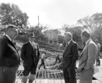 Workers repairing Brock's Monument, 1930 Workers who were repairing Brock's Monument sitting by the statue's head. In 1929, during a severe storm, one of the outstretched arms of General Brock was severed. In addition the head and shoulders of the statue and the upper part of the torso were almost shattered by lightning. Extensive repairs were begun the following year. One section of the statue was completely renewed, the whole shaft pointed to make it weather proof, lightning arresters were installed and a new railing placed at the top of the column" This description is from the Review The man in the fedora is Jim Davidson. -