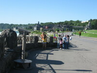 Tourists viewing the Niagara River from Table Rock with the illumination tower, ferris wheel, Sheraton hotel, Rainbow Bridge and Maid of the Mist boat in the background