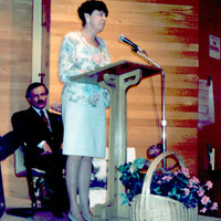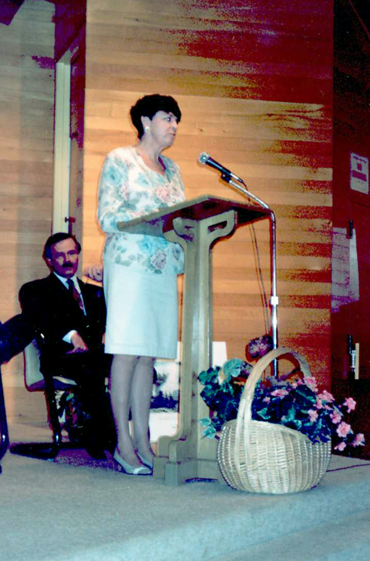 - Mayor Wayne Thomson of the City of Niagara Falls seated ; Margaret Harrington MPP speaking at the podium ;