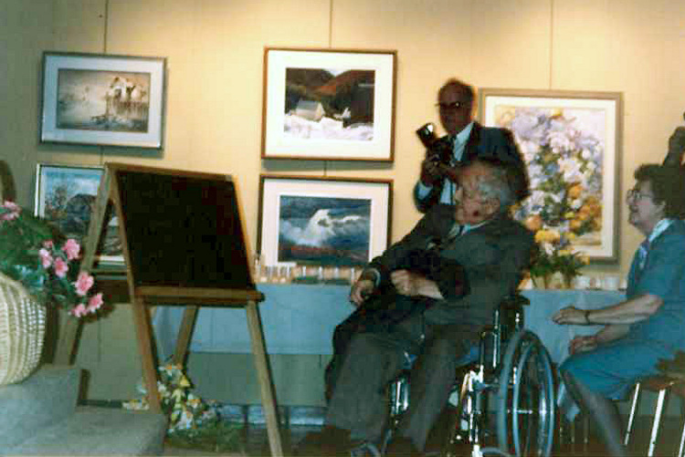 - George Seibel seated in wheelchair; Mrs. Olive Seibel right ;