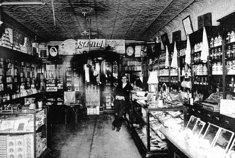 McNally's Drug Store Queen St circa 1920 - Ervin McNally owner centre of photograph