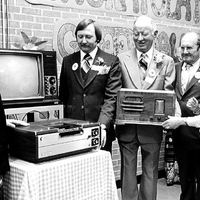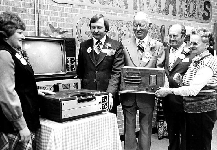 - en-CA From the Review, February 22, 1979. "30 years of progress. Greendale Home and School celebrated its 30th anniversary Tuesday with the presentation of a color VTR unit to the school. past presidents and the school's first principal attended the celebration along with parents and friends who enjoyed a skit recreating the first meeting of the group in 1949. At that time the Home and School presented a radio to the school. In the skit were Doug Brown, first president of the Home and School; Mrs. Pearl Bacon, acting for her husband harold who was second president; Mrs. Alma Badger, third president and Orm Embleton, the school's first principal. Making the presentation was the current president of the Home and School Mrs. Vonda Nixon, left, with A.L. (Bert) Warkentin, principal, receiving the unit. Holding the radio presented 30 years ago is Orm Embleton, with Doug Brown and Mrs. Pearl Bacon looking on. (Review photo by Gord Counsell)".