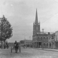 - buildings horse carriage wagon tower steeple stores businesses shops