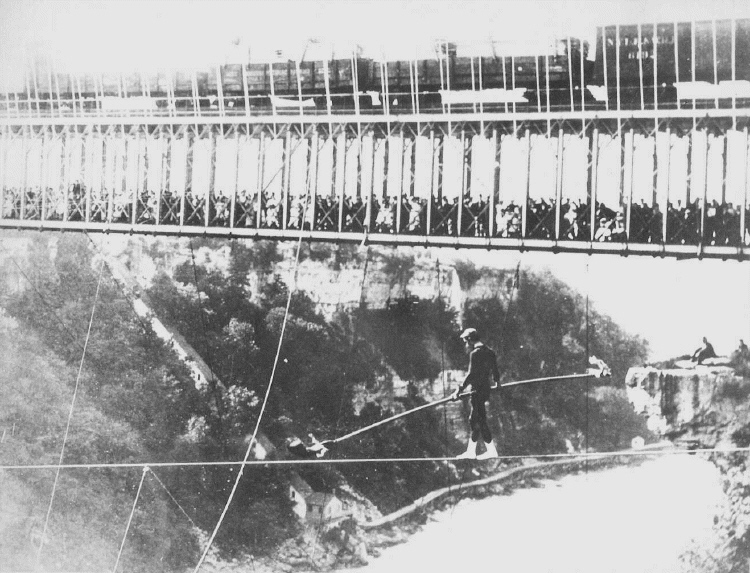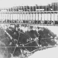 - Samuel Dixon Crossing Niagara on a Wire Cable with Railway Suspension Bridge in the Background
