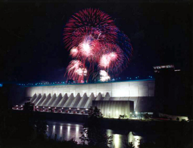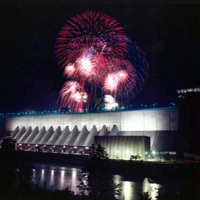 Fireworks light up the sky over the Robert Moses Power Generating Station Niagara Falls New York, viewed from Canada