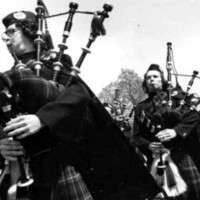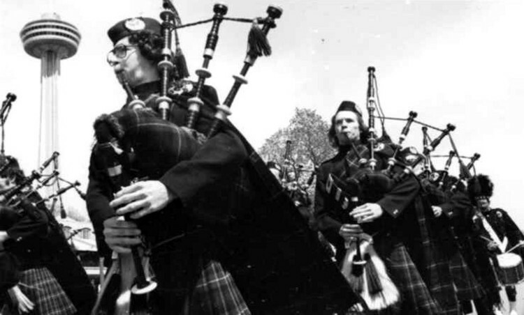 - Pipe Band marching in parade at Queen Victoria Park, Skylon Tower in the background
