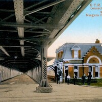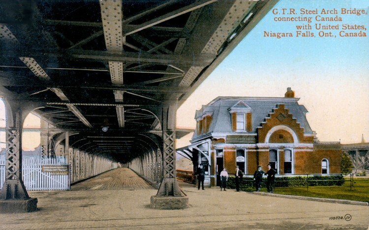 - G.T.R. [Grand Trunk Railway] Steel Arch Bridge connecting Canada with United States, Niagara Falls Ont. [Ontario] Canada
