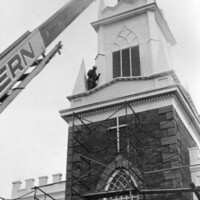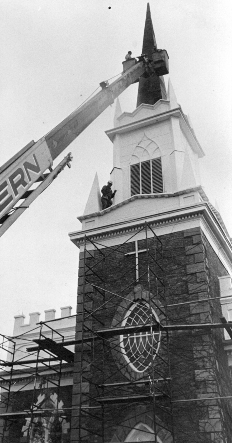 Holy Trinity Anglican Church Portage Road Chippawa, straightening the steeple during restoration work