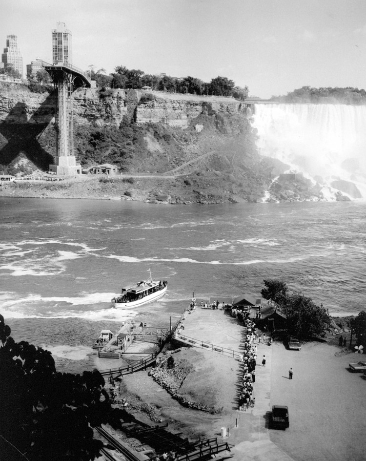Maid of the Mist leaving the landing dock in the Niagara Gorge, American Falls in background (right), Prospect Point Observation Tower (left)