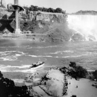 - Maid of the Mist leaving the landing dock in the Niagara Gorge, American Falls in background (right), Prospect Point Observation Tower (left)