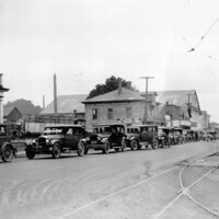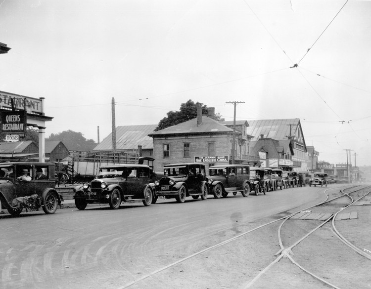 - Businesses include L-R: Queen's Restaurant, Prince of Wales Dance Club, Ceramic Shop, John Robinson and Sons Auto Works, Minon Abohbot Souvenirs, Imperial Oil Service Station ; street car tracks (lower right) ;