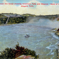 - View looking down the Gorge showing American Falls and steamer Maid of the Mist, Niagara Falls