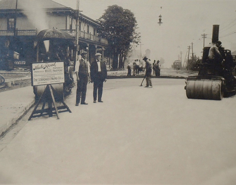 - Sign in centre of image reads Contractors - The Standard Paving Co. Ltd., Ottawa, Ontario ; the sign also indicates that Willite Permanent paving is being used, this is a process that was developed in Niagara Falls ;