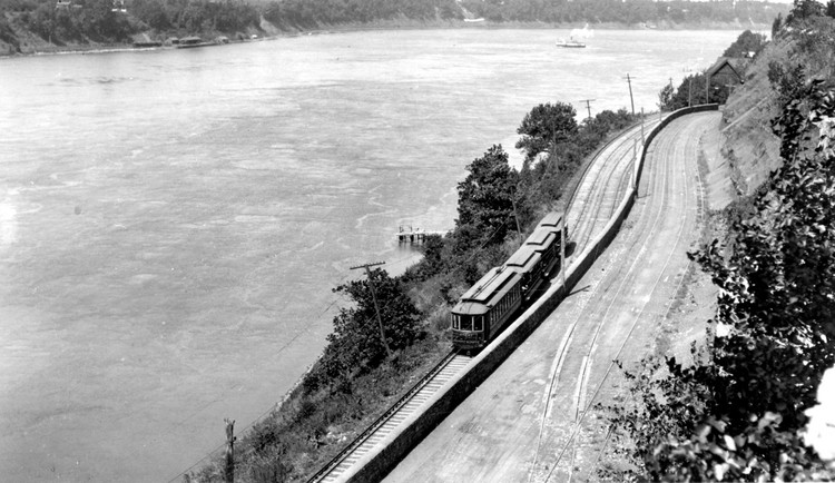 Great Gorge Route - Railway car with trailer on the US side - Queenston Dock in background
