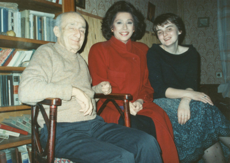 Barbara Frum in Moscow interviewing interpreter Dasha Rishkov and her father