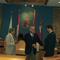 - L-R: Dean Iorfida City Clerk (seated) ; man holding plaque not identified ; Mayor Ted Salci ; Scott Wright ; John MacDonald CAO of the City of Niagara Falls (seated background right) ;