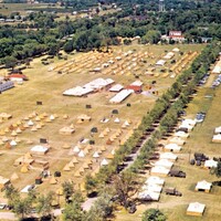 - en-CA The GP huts on the left were constructed in the mid-1960s, and housed the main kitchen. The centre road runs east to west, called Queen's Parade. Date approximate.