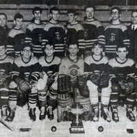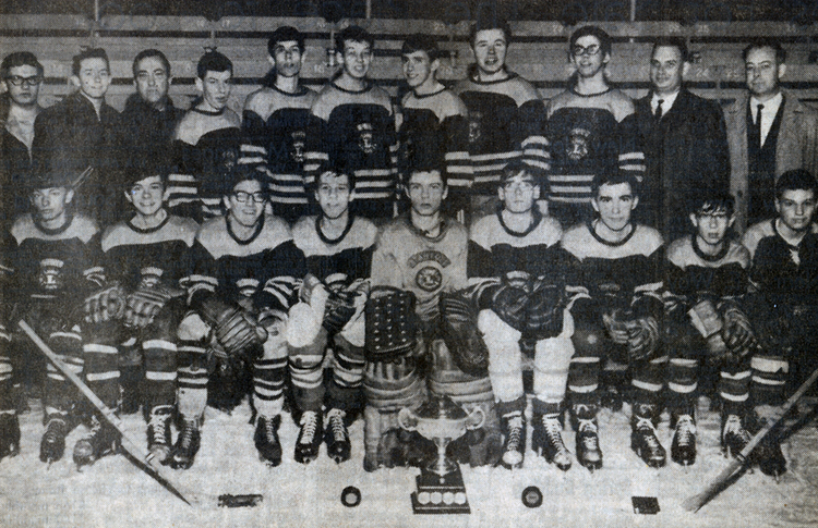 - Front row L-R: Bob Gomes, Ian Howatson, Captain Gord Sheridan, Randy Somerville, goalie Don Kuck, Marty Kruysse, Bruce Johnson, Wayne Gabrielli, Dan Weaver ; Back row L-R: Trainer Ted Neal, Assistant Coach Bill Irvine, Coach Earl Johnson, Tom Barnes, Len Stephens, Juim Youldan, Alex Hunter, Dave O'Banion, Pat Arbour, Lions Boys and Girls Chairman and first vice president of Stamford Lions John Chalmers ;