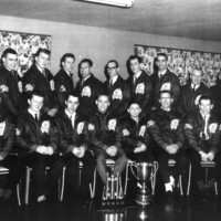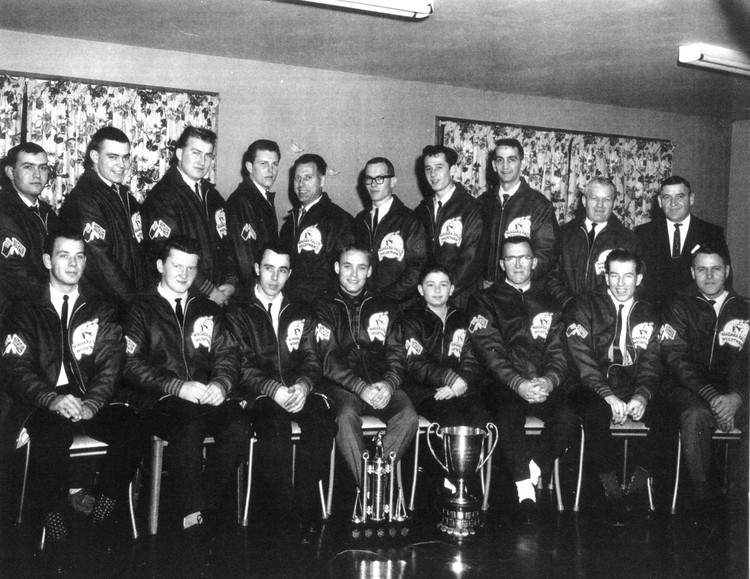 - Front Row L-R: Tom Collins, George Littlewood, Bev Thompson, Vic Conte, publicity man Jim Revell, Gary Hart, Fred Willis, coach Bud Heximer ; Back Row: Ray Pelletier, Frank Vormittag, Terry Mann, Doug Beaupit, assistant coach John Van Oosten, Gary Weightman, Jack Gallina, manager Fred Plato, sponsors Ed and Bill Weightman ; Missing from photo: Bill Ives, George Holmes, Rick Heximer ;