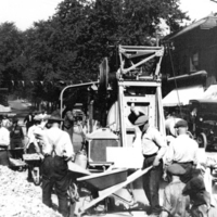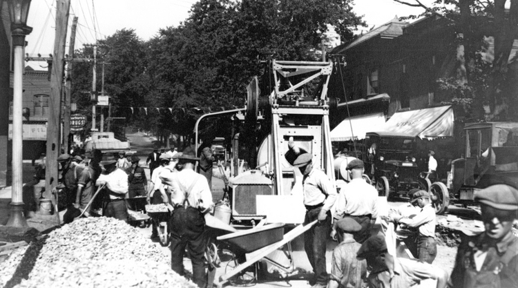 Construction workers excavating roadbed for new railway tracks on Ferry Street