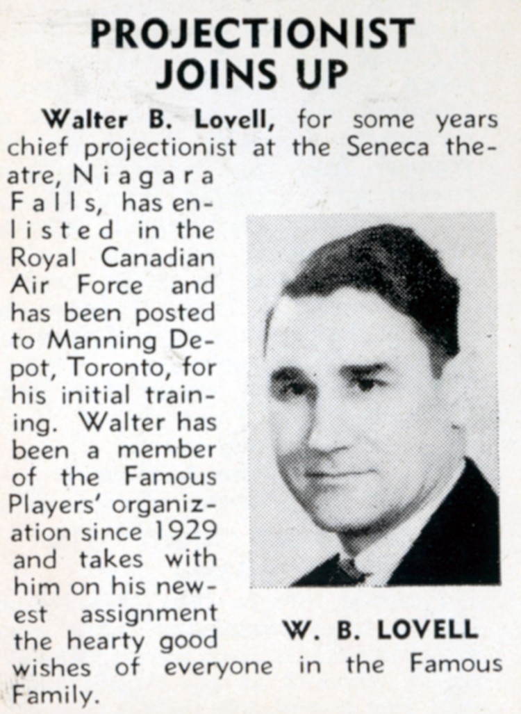 - en-CA Prior to enlisting was chief projectionist at the Famous Players Seneca Theatre Niagara Falls ;