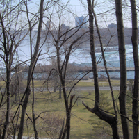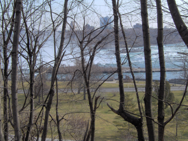 - Niagara River Parkway in foreground ; buildings of Niagara Falls NY in extreme background
