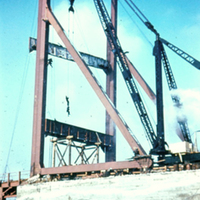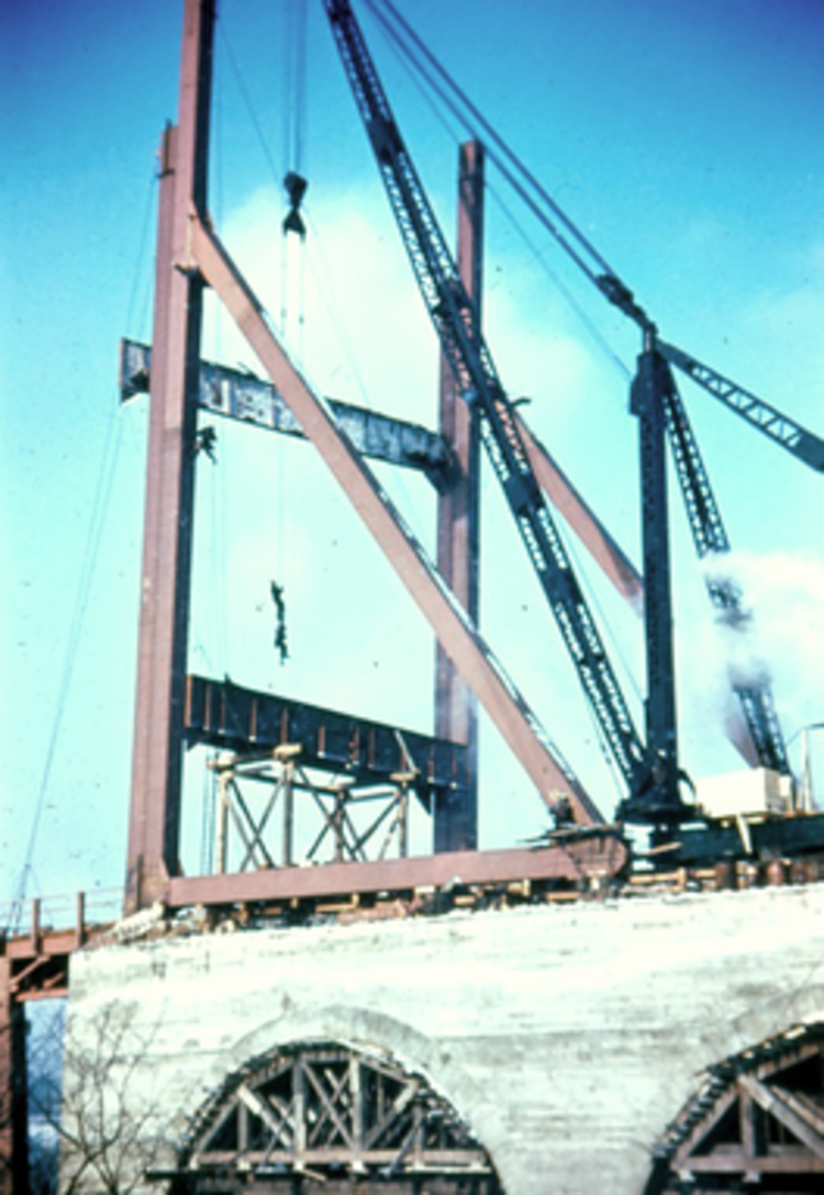 - Construction of the Rainbow Bridge - workers high above ground in the bridge supports