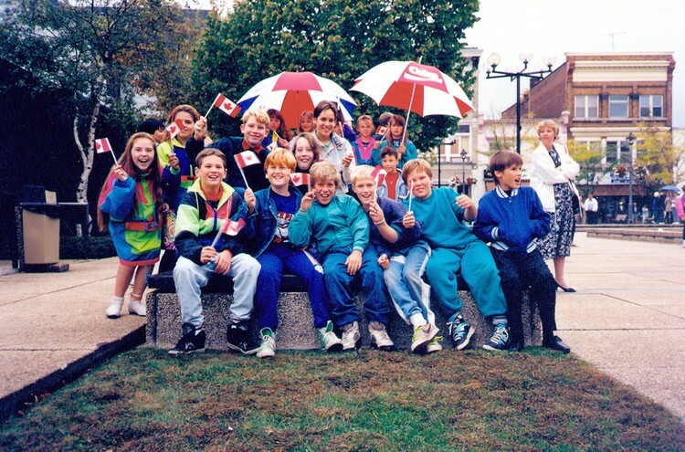 School children flying the flag at Centennial Square Niagara Falls City Hall during the visit of the Governor General of Canada The Right Honourable Ramon John (Ray) Hnatyshyn