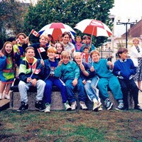 - School children flying the flag at Centennial Square Niagara Falls City Hall during the visit of the Governor General of Canada The Right Honourable Ramon John (Ray) Hnatyshyn