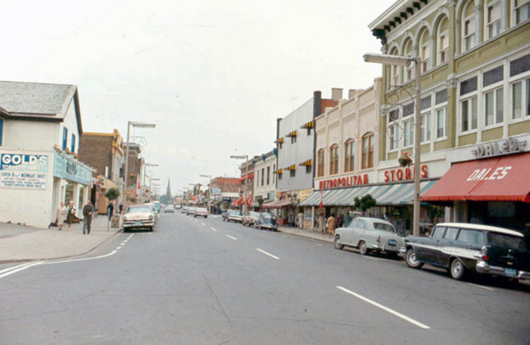 - en-CA Funding for scanning provided by a grant from Historic Niagara Development Inc.. The Metropolitan department store visible on the right. Saint Patrick's Roman Catholic Church visible in the back. The date of this picture is unknown.