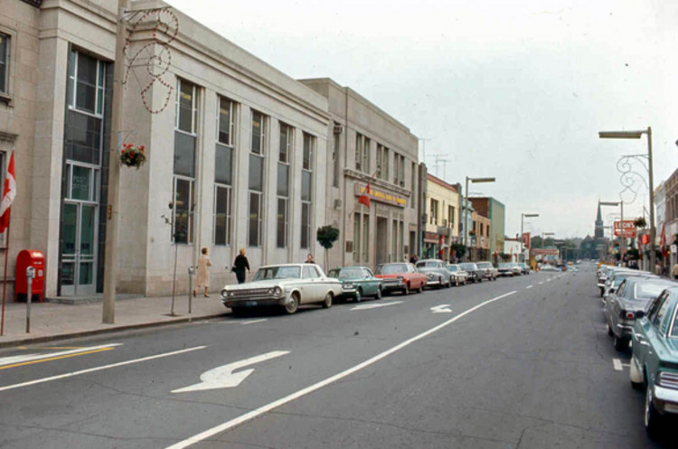 - en-CA Funding for scanning provided by a grant from Historic Niagara Development Inc.. Post Office and Canadian Imperial Bank of Commerce visible on the left. Saint Patrick's Roman Catholic Church visible in the back. The date of this picture is unknown.