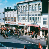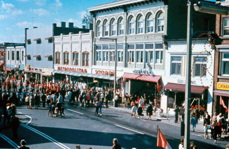 - en-CA Funding for scanning provided by a grant from Historic Niagara Development Inc.. Metropolitan Department Store, Dale's Paris Shop, Gullion's Men's Wear and Cataract Sports, Hobbies and Slot Racing tracks are visible on the right. The date of this photograph is unknown.