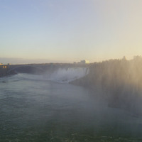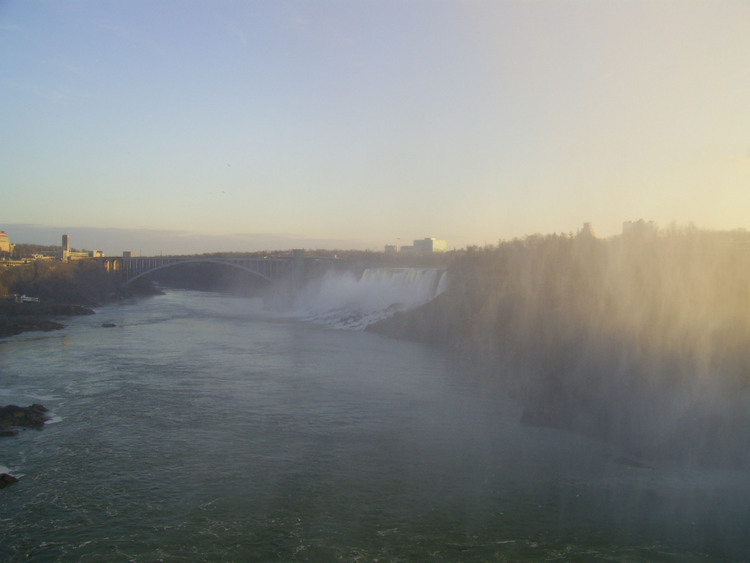 - American Falls and Rainbow Bridge seen through the mist at the brink of the Horseshoe Falls